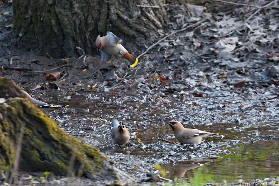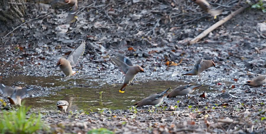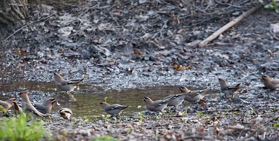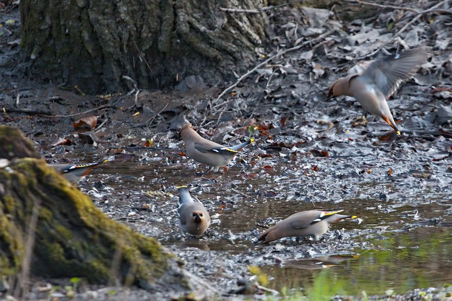 Мои любимые свиристели, которых я тщетно искал в парке всю зиму, сбились в изрядную стаю под сотню особей и свиристят с утра до вечера по верхним веткам. Выгуливая псину, набрел на бочажок, который они освоили под водопой.